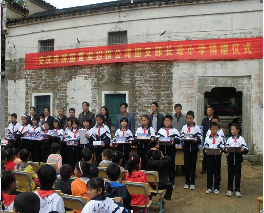9月29日,安慶市房屋置業(yè)擔(dān)保公司團(tuán)支部組織團(tuán)員青年一行18人,來到桐城市唐灣鎮(zhèn)長(zhǎng)嶺小學(xué),向該校師生捐贈(zèng)了價(jià)值7000余元的學(xué)習(xí)用品及服裝等物資。桐城市團(tuán)市委、唐灣鎮(zhèn)政府相關(guān)領(lǐng)導(dǎo)及該校師生100多人參加了此項(xiàng)活動(dòng)?! ?br />       在學(xué)校操場(chǎng),該校舉行了熱烈地歡迎儀式,學(xué)生們手捧鮮花夾道歡迎,現(xiàn)場(chǎng)該校80多名小學(xué)生歡喜地領(lǐng)到了新書包、新鉛筆盒、新畫板、新作業(yè)本等文具。置業(yè)擔(dān)保公司負(fù)責(zé)同志表示,培養(yǎng)教育兒童不僅是學(xué)校的責(zé)任、老師的責(zé)任,更是社會(huì)乃至每個(gè)人義不容辭的責(zé)任。該公司團(tuán)員青年情系山區(qū),心系長(zhǎng)嶺,踴躍捐款,本次活動(dòng)中雖然捐贈(zèng)的物資不多,卻凝聚著全體團(tuán)員青年的愛心,同時(shí),希望與長(zhǎng)嶺小學(xué)建立定期幫扶機(jī)制,幫助該校的發(fā)展。